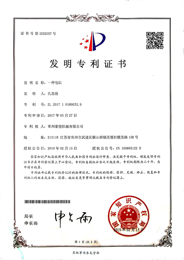 《一種電缸》發(fā)明專(zhuān)利證書(shū)